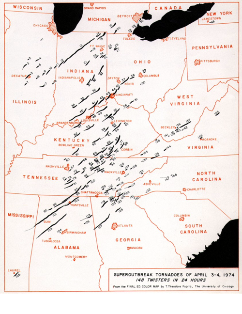 This is the first outbreak map ever made. It shows all 148 of the tornados.