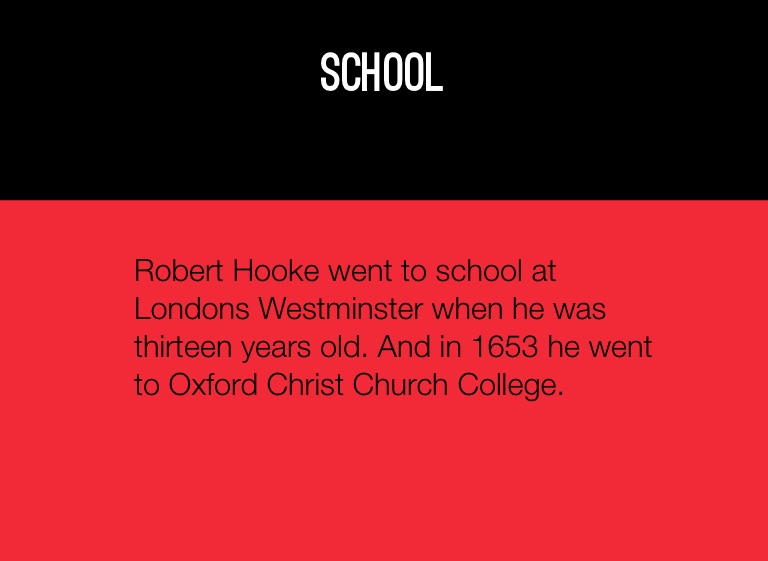 Robert Hooke went to school at Londons Westminster when he was thirteen years old. And in 1653 he went to Oxford Christ Church College.
