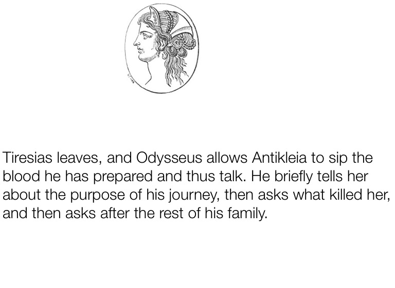 Tiresias leaves, and Odysseus allows Antikleia to sip the blood he has prepared and thus talk. He briefly tells her about the purpose of his journey, then asks what killed her, and then asks after the rest of his family.