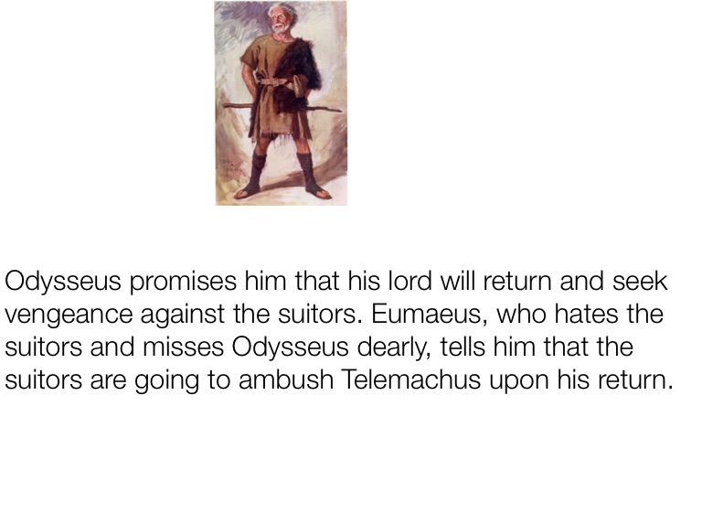 Odysseus promises him that his lord will return and seek vengeance against the suitors. Eumaeus, who hates the suitors and misses Odysseus dearly, tells him that the suitors are going to ambush Telemachus upon his return.
