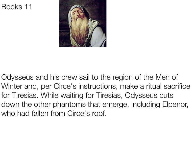 Odysseus and his crew sail to the region of the Men of Winter and, per Circe's instructions, make a ritual sacrifice for Tiresias. While waiting for Tiresias, Odysseus cuts down the other phantoms that emerge, including Elpenor, who had fallen from Circe's roof.