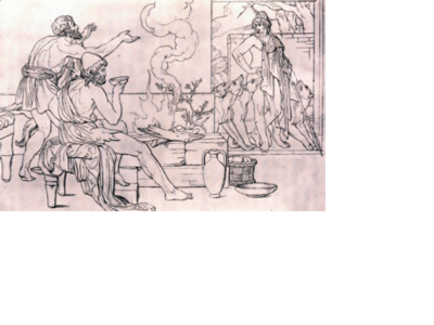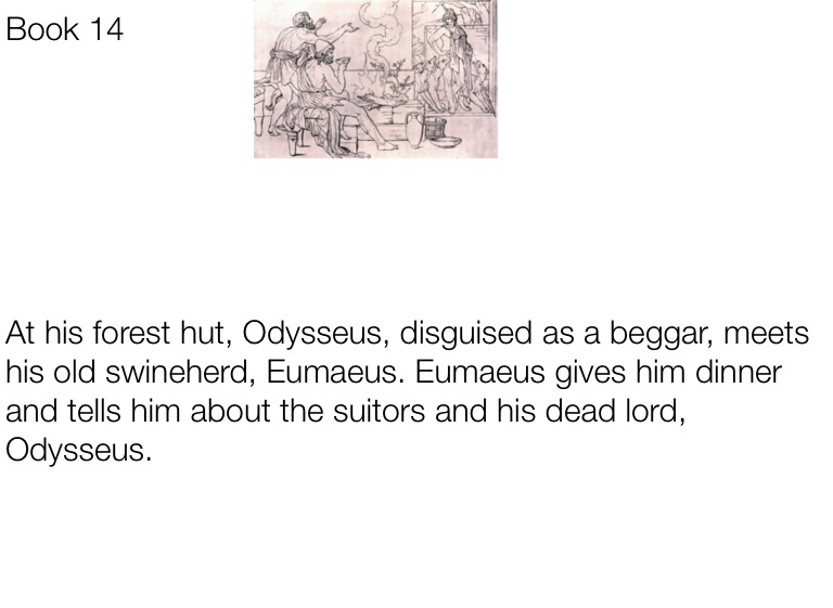 At his forest hut, Odysseus, disguised as a beggar, meets his old swineherd, Eumaeus. Eumaeus gives him dinner and tells him about the suitors and his dead lord, Odysseus.