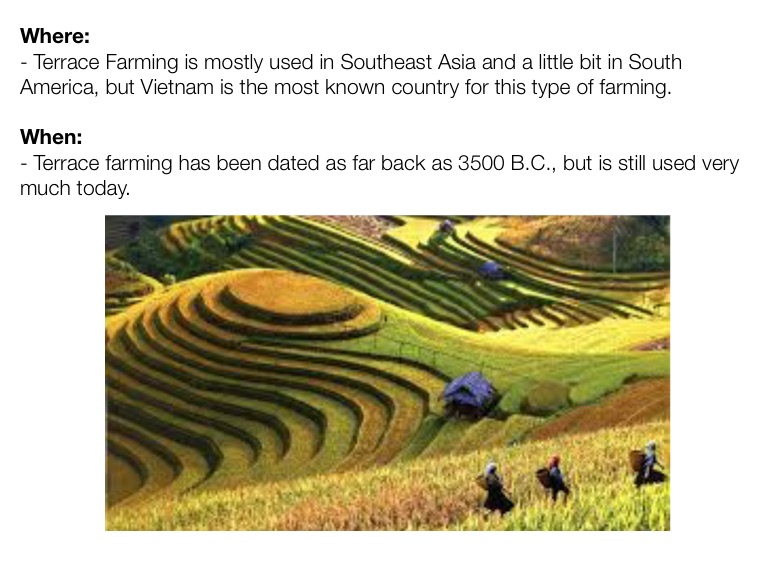 - Terrace farming has been dated as far back as 3500 B.C., but is still used very much today.