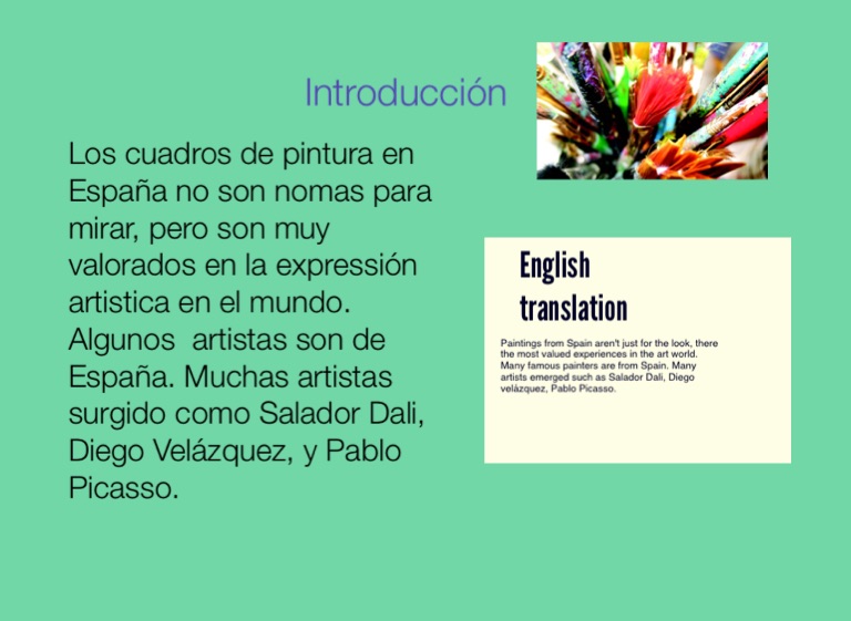 Los cuadros de pintura en España no son nomas para mirar, pero son muy valorados en la expressión artistica en el mundo. Algunos artistas son de España. Muchas artistas surgido como Salador Dali, Diego Velázquez, y Pablo Picasso.
