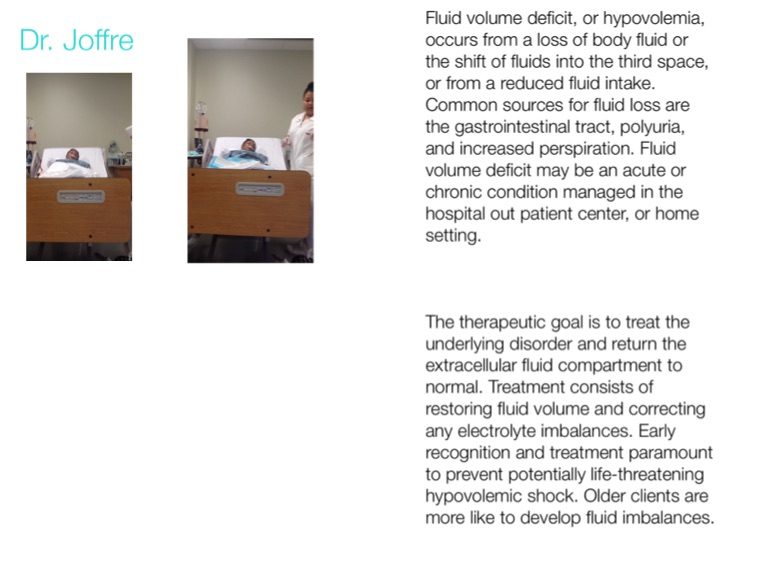 Fluid volume deficit, or hypovolemia, occurs from a loss of body fluid or the shift of fluids into the third space, or from a reduced fluid intake. Common sources for fluid loss are the gastrointestinal tract, polyuria, and increased perspiration. Fluid volume deficit may be an acute or chronic condition managed in the hospital out patient center, or home setting.