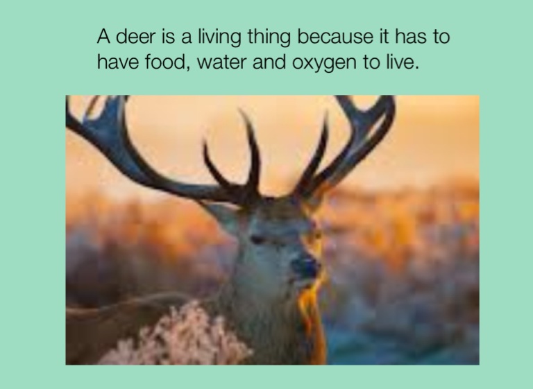 A deer is a living thing because it has to have food, water and oxygen to live.