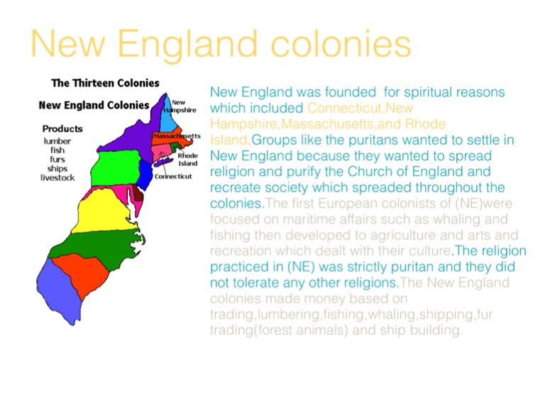 New England was founded for spiritual reasons which included Connecticut,New Hampshire,Massachusetts,and Rhode Island.Groups like the puritans wanted to settle in New England because they wanted to spread religion and purify the Church of England and recreate society which spreaded throughout the colonies.The first European colonists of (NE)were focused on maritime affairs such as whaling and fishing then developed to agriculture and arts and recreation which dealt with their culture.The religion practiced in (NE) was strictly puritan and they did not tolerate any other religions.The New England colonies made money based on trading,lumbering,fishing,whaling,shipping,fur trading(forest animals) and ship building.