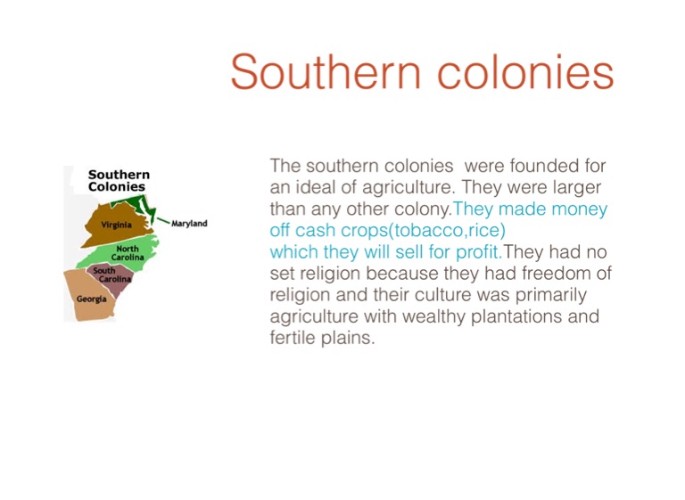 The southern colonies were founded for an ideal of agriculture. They were larger than any other colony.They made money off cash crops(tobacco,rice)