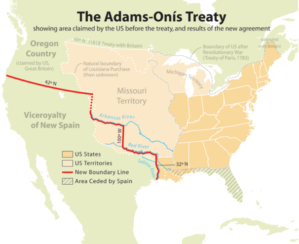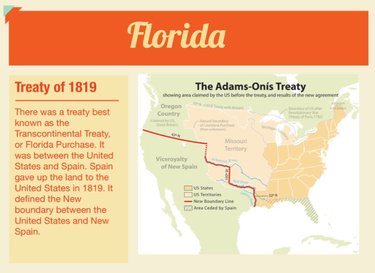 There was a treaty best known as the Transcontinental Treaty, or Florida Purchase. It was between the United States and Spain. Spain gave up the land to the United States in 1819. It defined the New boundary between the United States and New Spain.