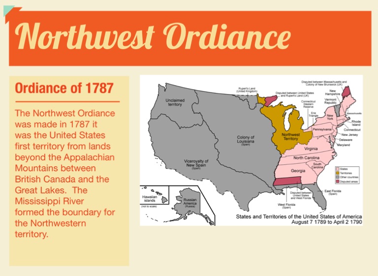 The Northwest Ordiance was made in 1787 it was the United States first territory from lands beyond the Appalachian Mountains between British Canada and the Great Lakes. The Mississippi River formed the boundary for the Northwestern territory.