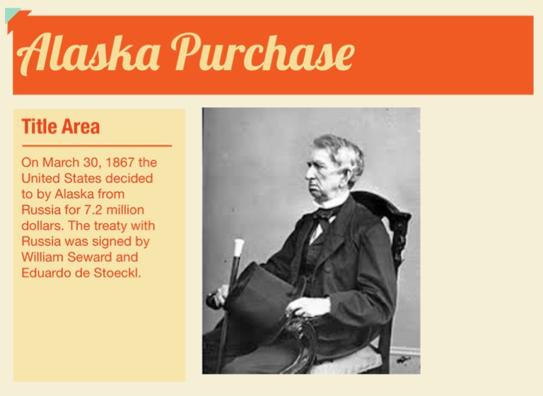 On March 30, 1867 the United States decided to by Alaska from Russia for 7.2 million dollars. The treaty with Russia was signed by William Seward and Eduardo de Stoeckl.