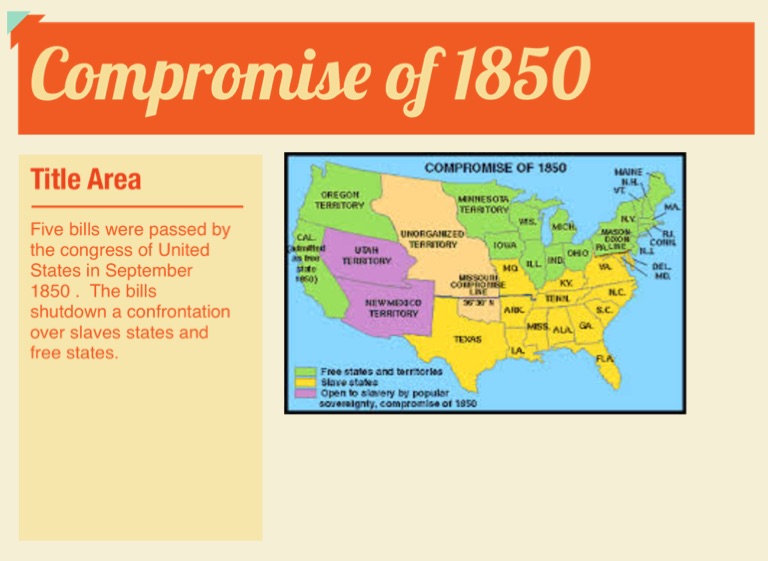 Five bills were passed by the congress of United States in September 1850 . The bills shutdown a confrontation over slaves states and free states.