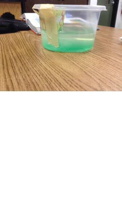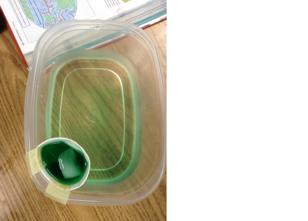 The density of the cold water makes it sink to the bottom of the container, bringing the green dye with it, as you can see in these pictures.