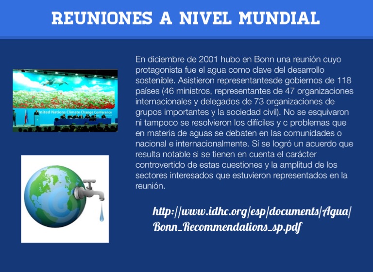 En diciembre de 2001 hubo en Bonn una reunión cuyo protagonista fue el agua como clave del desarrollo sostenible. Asistieron representantesde gobiernos de 118 países (46 ministros, representantes de 47 organizaciones internacionales y delegados de 73 organizaciones de grupos importantes y la sociedad civil). No se esquivaron ni tampoco se resolvieron los difíciles y c problemas que en materia de aguas se debaten en las comunidades o nacional e internacionalmente. Sí se logró un acuerdo que resulta notable si se tienen en cuenta el carácter controvertido de estas cuestiones y la amplitud de los sectores interesados que estuvieron representados en la reunión.