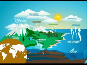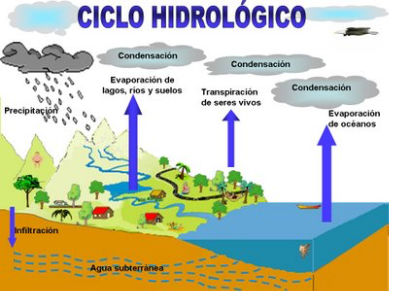 Describe el movimiento continuo y cíclico del agua en el planeta Tierra. El ciclo empieza cuando el Sol calienta el agua de los mares y los océanos, parte del agua se evapora en vapor de agua. Las corrientes de aire toman el vapor de la atmósfera, el vapor se eleva en el aire, donde las temperaturas frías hacen que se condense en nubes. Las partículas de las nubes chocan, crecen y caen del cielo como precipitación. La mayor parte de la precipitación cae sobre los océanos donde fluye sobre la superficie. Una parte de esa agua entra en los ríos a través de valles y la corriente mueve el agua hacia los océanos. El agua filtrada pasa a las aguas subterráneas, que se acumulan y se almacenan como agua dulce en lagos. Un poco de agua se infiltra y rellena acuíferos. Con el tiempo, el agua sigue fluyendo, para entrar de nuevo en el océano, donde el ciclo se renueva.