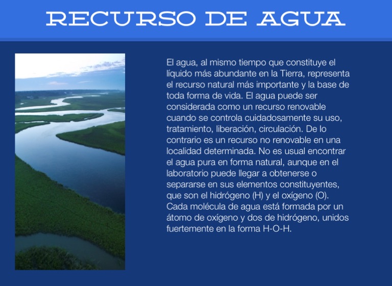 El agua, al mismo tiempo que constituye el líquido más abundante en la Tierra, representa el recurso natural más importante y la base de toda forma de vida. El agua puede ser considerada como un recurso renovable cuando se controla cuidadosamente su uso, tratamiento, liberación, circulación. De lo contrario es un recurso no renovable en una localidad determinada. No es usual encontrar el agua pura en forma natural, aunque en el laboratorio puede llegar a obtenerse o separarse en sus elementos constituyentes, que son el hidrógeno (H) y el oxígeno (O). Cada molécula de agua está formada por un átomo de oxígeno y dos de hidrógeno, unidos fuertemente en la forma H-O-H.