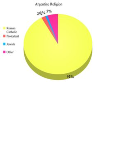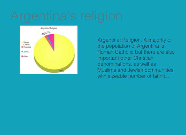 Argentina: Religion. A majority of the population of Argentina is Roman Catholic but there are also important other Christian denominations, as well as Muslims and Jewish communities, with sizeable number of faithful.