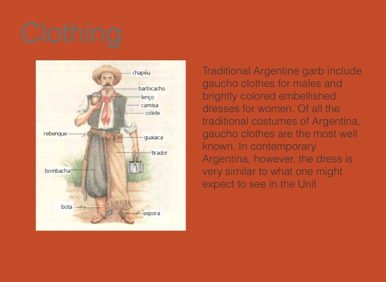 Traditional Argentine garb include gaucho clothes for males and brightly colored embellished dresses for women. Of all the traditional costumes of Argentina, gaucho clothes are the most well known. In contemporary Argentina, however, the dress is very similar to what one might expect to see in the Unit