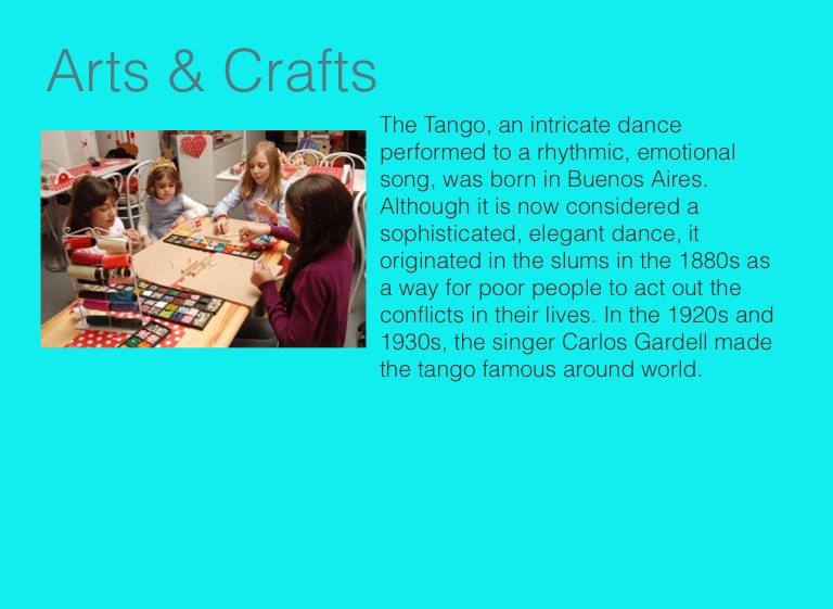 The Tango, an intricate dance performed to a rhythmic, emotional song, was born in Buenos Aires. Although it is now considered a sophisticated, elegant dance, it originated in the slums in the 1880s as a way for poor people to act out the conflicts in their lives. In the 1920s and 1930s, the singer Carlos Gardell made the tango famous around world.