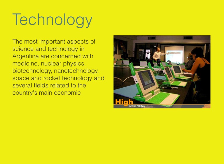 The most important aspects of science and technology in Argentina are concerned with medicine, nuclear physics, biotechnology, nanotechnology, space and rocket technology and several fields related to the country's main economic