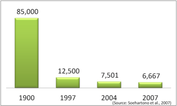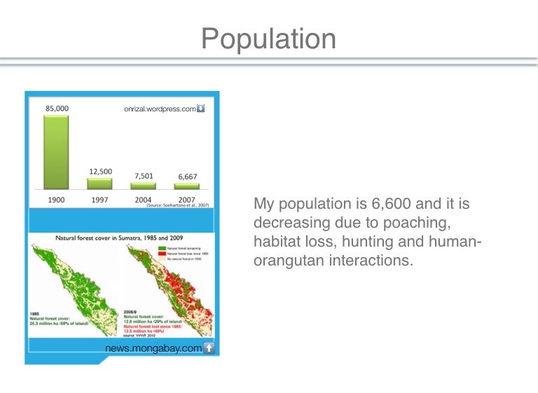 My population is 6,600 and it is decreasing due to poaching, habitat loss, hunting and human-orangutan interactions.
