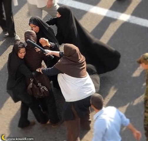 This image was taken in Iran during a "peaceful" gathering to try to spread awareness about the inequality of women. The government did not respect the request of these women and responded violently by beating them with nightsticks. In this image, you can see the four policewomen (the ones wearing veils) grabbing and beating a women not wearing a veil. In any country ruled by Islamic Law, women may live under extreme oppression. Women can be beaten, raped, and killed without legal attention. Their whole lives and everything they do is influenced by their extreme inequality. In Persepolis, throughout the book, certain Iranian laws prevented them from normal freedoms. Marjane from the time she was very young had few freedoms. She was forced to wear the veil at a very young age. The veil is not just a physical piece of clothing. It is also a metaphor. The veil is a symbol of oppression covering the face of opportunity. When oppression is lifted, freedom is achieved. Marjane stated that when coming back to Iran, wearing the veil is her least favorite thing because it constantly reminds her she is less of a person (Shmoop Editorial Team, 2008). To her, it is less about wearing the clothing. It is about having restricted freedom. This shows how the single piece of cloth can strip women of their dignity and individuality. The old veil of oppression and restriction, as shown in this photo, should be lifted leaving the face of freedom.
