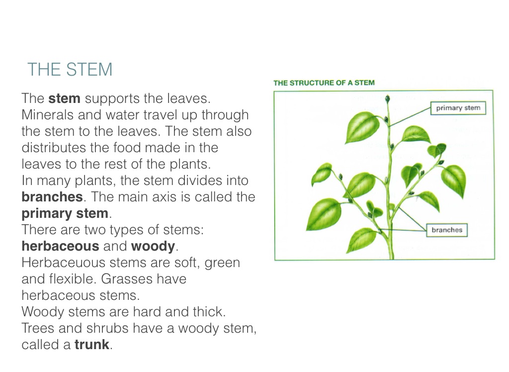 There are two types of stems: herbaceous and woody. Herbaceuous stems are soft, green and flexible. Grasses have herbaceous stems.