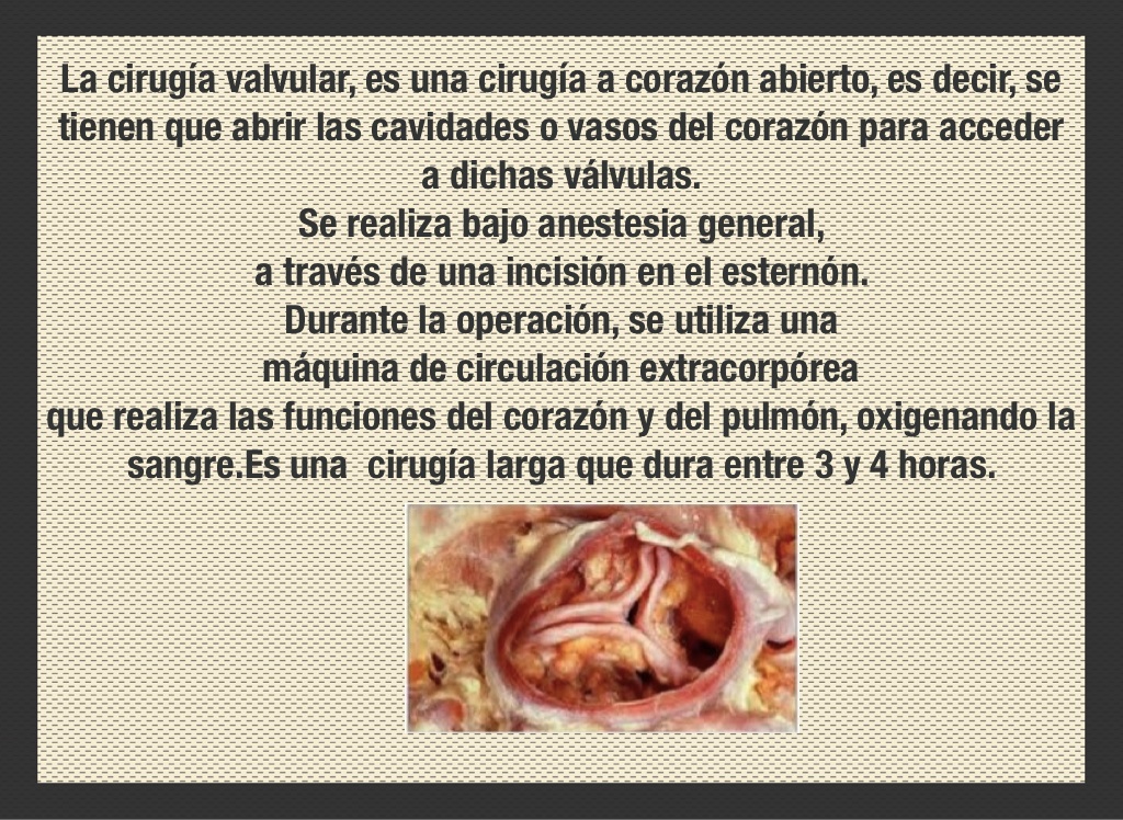 La cirugía valvular, es una cirugía a corazón abierto, es decir, se tienen que abrir las cavidades o vasos del corazón para acceder a dichas válvulas.