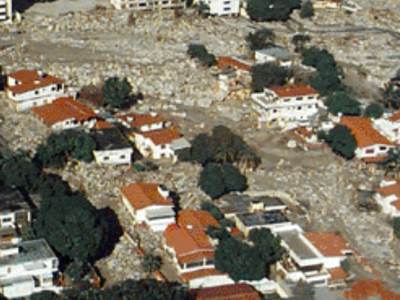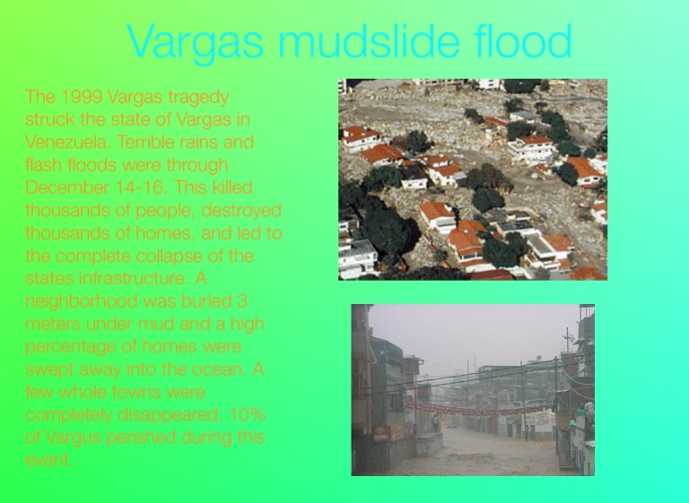 The 1999 Vargas tragedy struck the state of Vargas in Venezuela. Terrible rains and flash floods were through December 14-16. This killed thousands of people, destroyed thousands of homes, and led to the complete collapse of the states infrastructure. A neighborhood was buried 3 meters under mud and a high percentage of homes were swept away into the ocean. A few whole towns were completely disappeared. 10% of Vargus perished during this event.