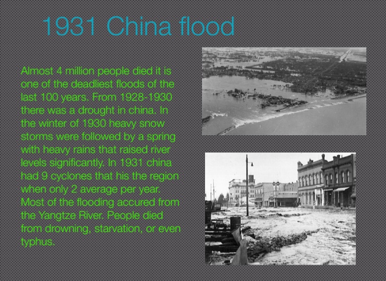 Almost 4 million people died it is one of the deadliest floods of the last 100 years. From 1928-1930 there was a drought in china. In the winter of 1930 heavy snow storms were followed by a spring with heavy rains that raised river levels significantly. In 1931 china had 9 cyclones that his the region when only 2 average per year. Most of the flooding accured from the Yangtze River. People died from drowning, starvation, or even typhus.