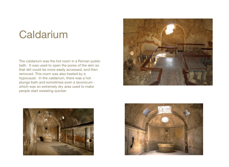 The caldarium was the hot room in a Roman public bath. It was used to open the pores of the skin so that dirt could be more easily accessed, and then removed. This room was also heated by a hypocaust. In the caldarium, there was a hot plunge bath and sometimes even a laconicum - which was an extremely dry area used to make people start sweating quicker.