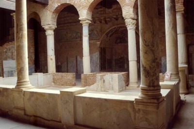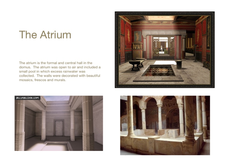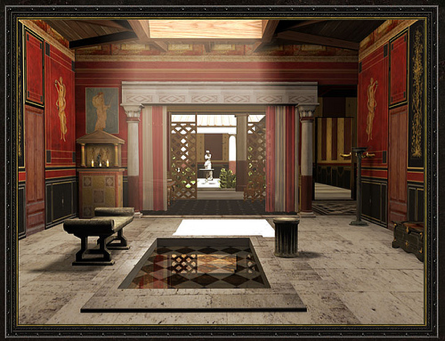 The atrium is the formal and central hall in the domus. The atrium was open to air and included a small pool in which excess rainwater was collected. The walls were decorated with beautiful