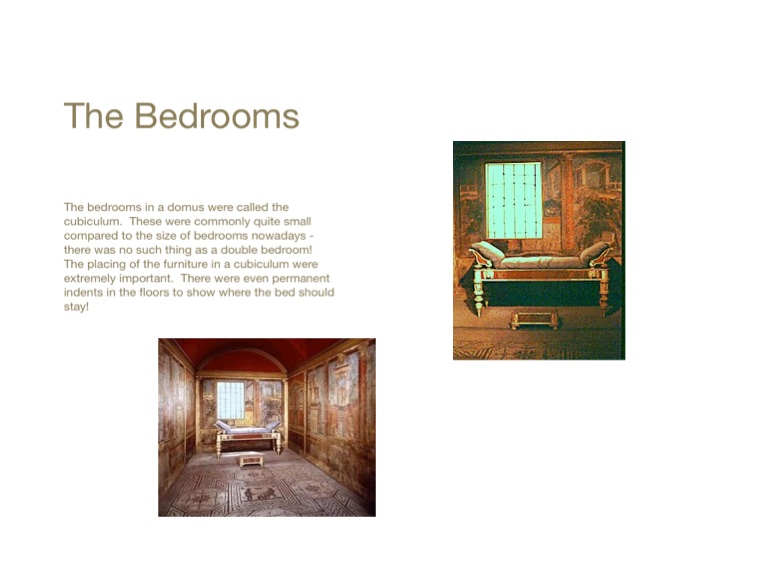 The bedrooms in a domus were called the cubiculum. These were commonly quite small compared to the size of bedrooms nowadays - there was no such thing as a double bedroom!