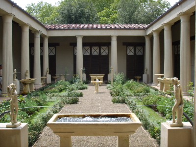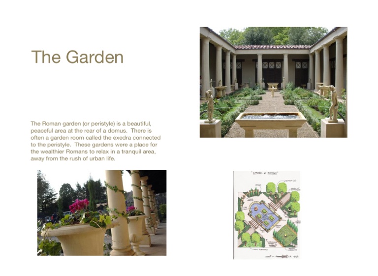 The Roman garden (or peristyle) is a beautiful, peaceful area at the rear of a domus. There is often a garden room called the exedra connected to the peristyle. These gardens were a place for the wealthier Romans to relax in a tranquil area, away from the rush of urban life.
