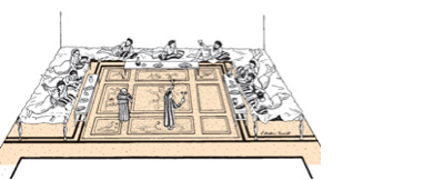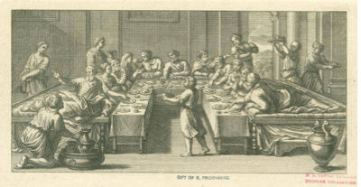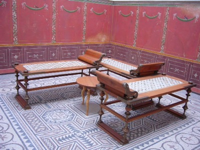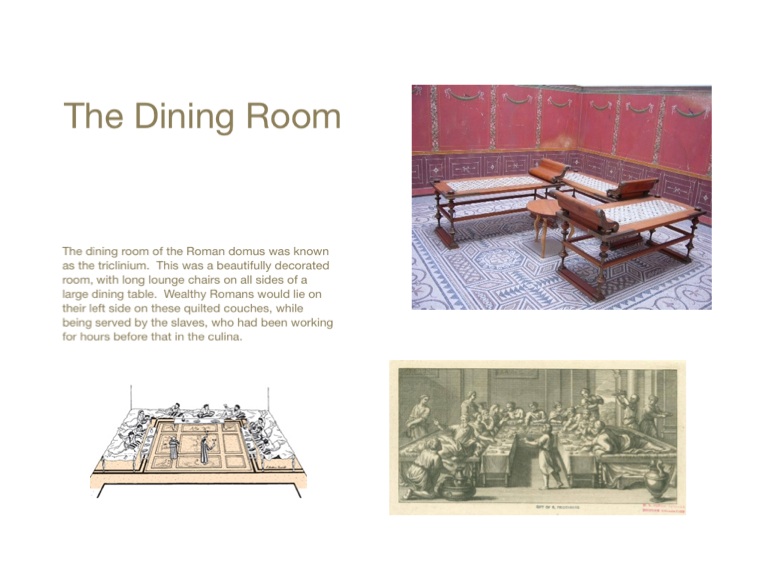The dining room of the Roman domus was known as the triclinium. This was a beautifully decorated room, with long lounge chairs on all sides of a large dining table. Wealthy Romans would lie on their left side on these quilted couches, while being served by the slaves, who had been working for hours before that in the culina.