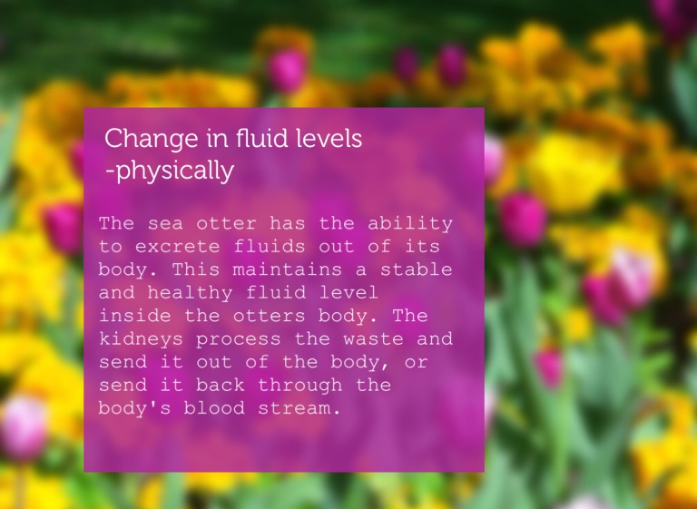 The sea otter has the ability to excrete fluids out of its body. This maintains a stable and healthy fluid level inside the otters body. The kidneys process the waste and send it out of the body, or send it back through the body's blood stream.