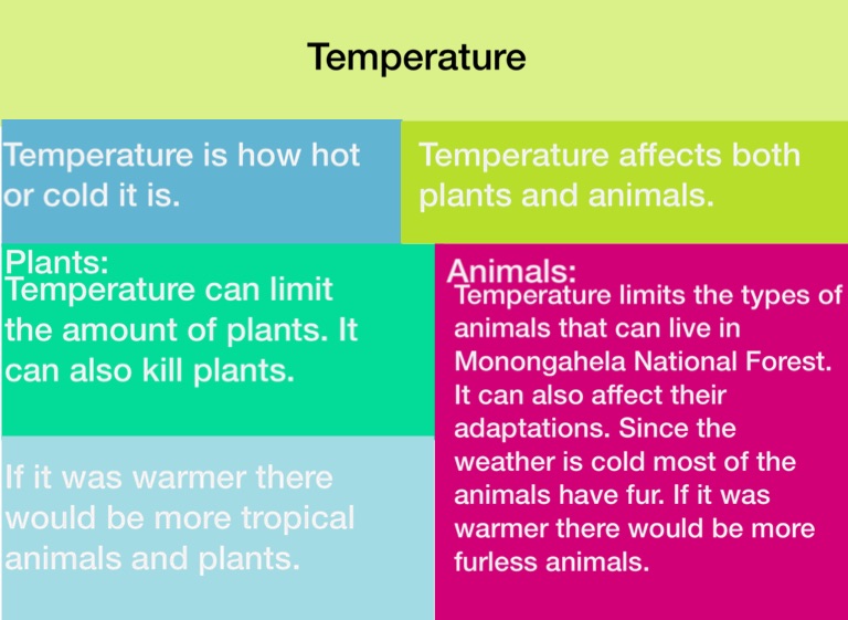 Temperature limits the types of animals that can live in Monongahela National Forest. It can also affect their adaptations. Since the weather is cold most of the animals have fur. If it was warmer there would be more furless animals.