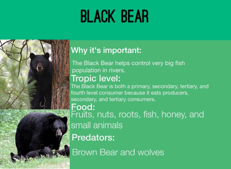 The Black Bear is both a primary, secondary, tertiary, and fourth level consumer because it eats producers, secondary, and tertiary consumers.