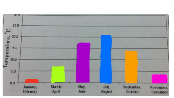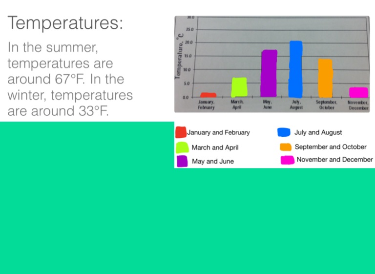 In the summer, temperatures are around 67°F. In the winter, temperatures are around 33°F.
