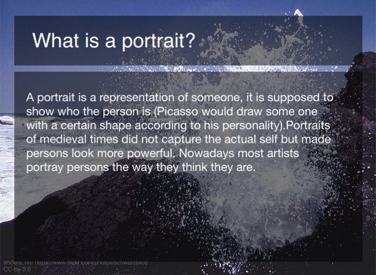 A portrait is a representation of someone, it is supposed to show who the person is (Picasso would draw some one with a certain shape according to his personality).Portraits of medieval times did not capture the actual self but made persons look more powerful. Nowadays most artists portray persons the way they think they are.