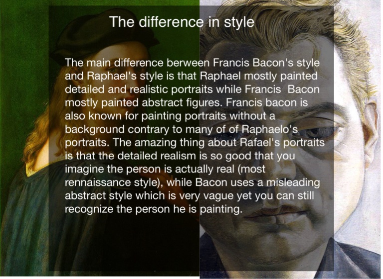 The main difference berween Francis Bacon's style and Raphael's style is that Raphael mostly painted detailed and realistic portraits while Francis Bacon mostly painted abstract figures. Francis bacon is also known for painting portraits without a background contrary to many of of Raphaelo's portraits. The amazing thing about Rafael's portraits is that the detailed realism is so good that you imagine the person is actually real (most rennaissance style), while Bacon uses a misleading abstract style which is very vague yet you can still recognize the person he is painting.
