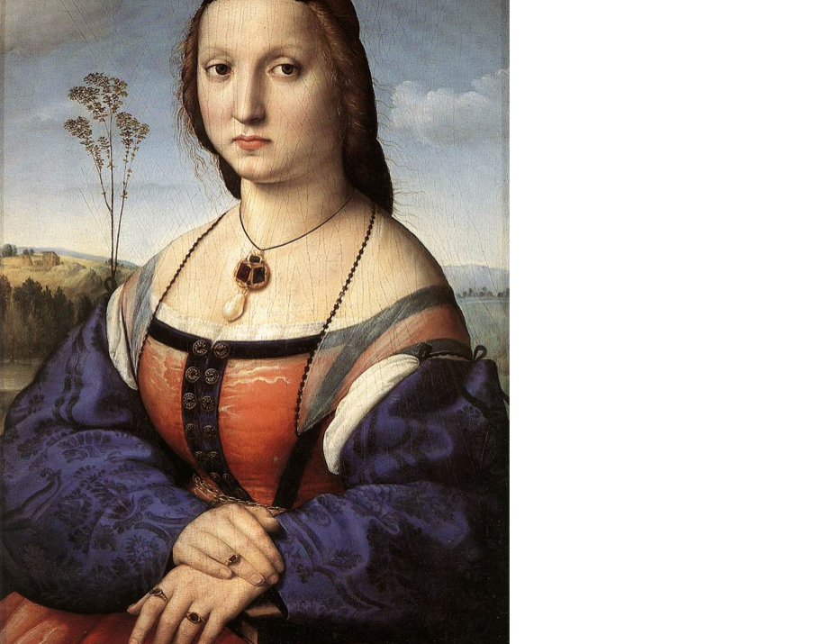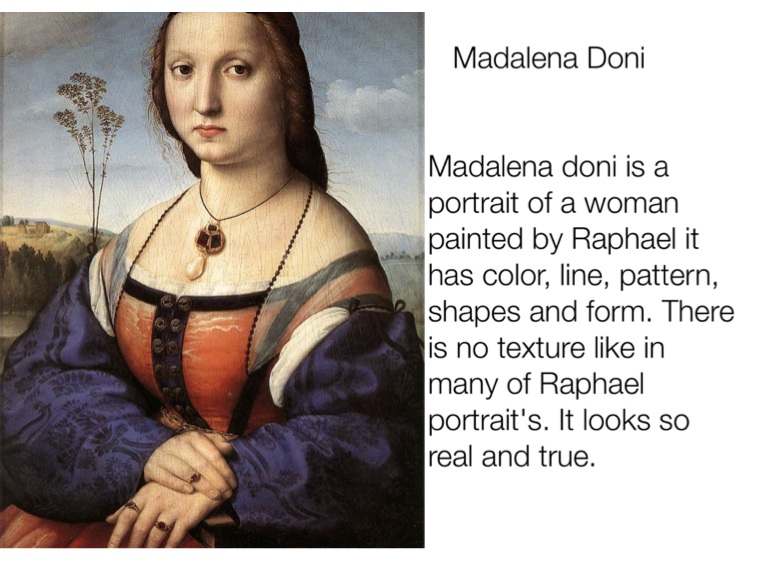 Madalena doni is a portrait of a woman painted by Raphael it has color, line, pattern, shapes and form. There is no texture like in many of Raphael portrait's. It looks so real and true.