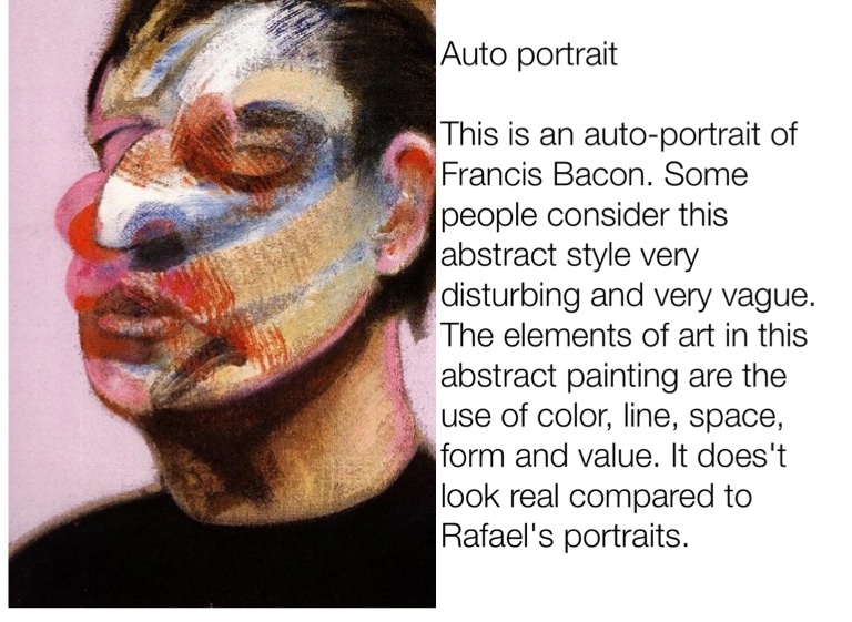 This is an auto-portrait of Francis Bacon. Some people consider this abstract style very disturbing and very vague. The elements of art in this abstract painting are the use of color, line, space, form and value. It does't look real compared to Rafael's portraits.