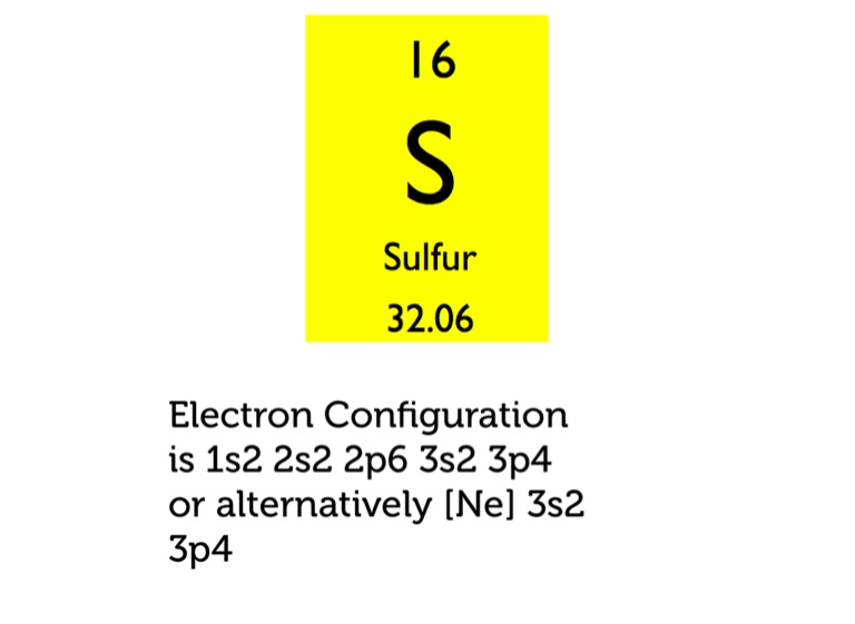 Electron Configuration is 1s2 2s2 2p6 3s2 3p4 or alternatively [Ne] 3s2 3p4