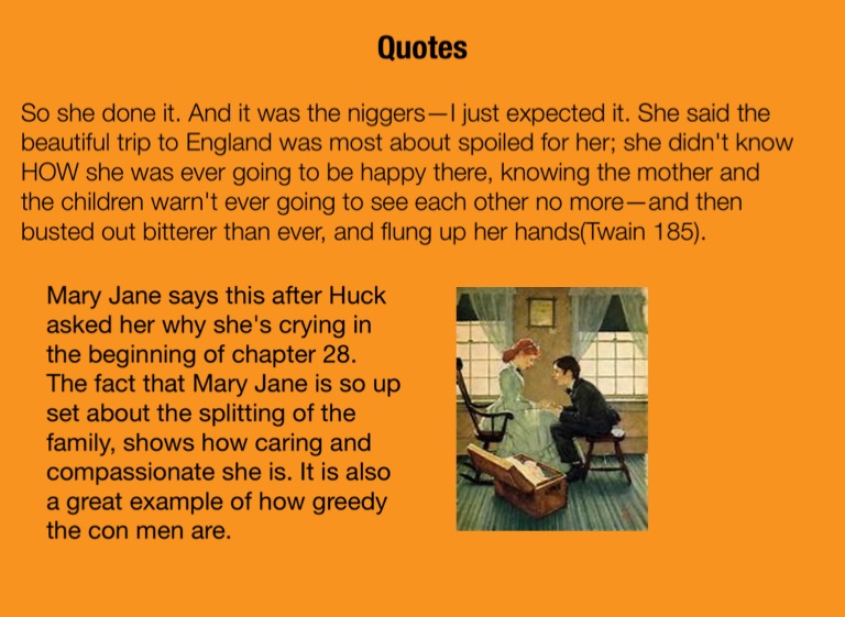 So she done it. And it was the niggers—I just expected it. She said the beautiful trip to England was most about spoiled for her; she didn't know HOW she was ever going to be happy there, knowing the mother and the children warn't ever going to see each other no more—and then busted out bitterer than ever, and flung up her hands(Twain 185).