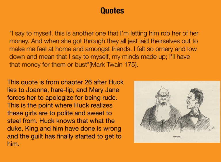 This quote is from chapter 26 after Huck lies to Joanna, hare-lip, and Mary Jane forces her to apologize for being rude. This is the point where Huck realizes these girls are to polite and sweet to steel from. Huck knows that what the duke, King and him have done is wrong and the guilt has finally started to get to him.