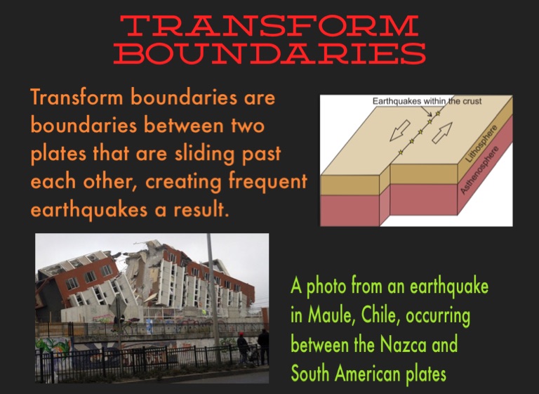Transform boundaries are boundaries between two plates that are sliding past each other, creating frequent earthquakes a result.