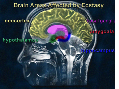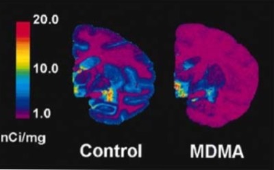 Dr. George Ricuarte used a PET scan of MDMA users brains as an indicator for how much damage the drug caused. The scans showed that there was indeed brain damage in users. It also showed that an increase in the frequency of use leads to an increase in brain damage. The PET scan actually showed a 20-60% reduction in healthy serotonin cells.