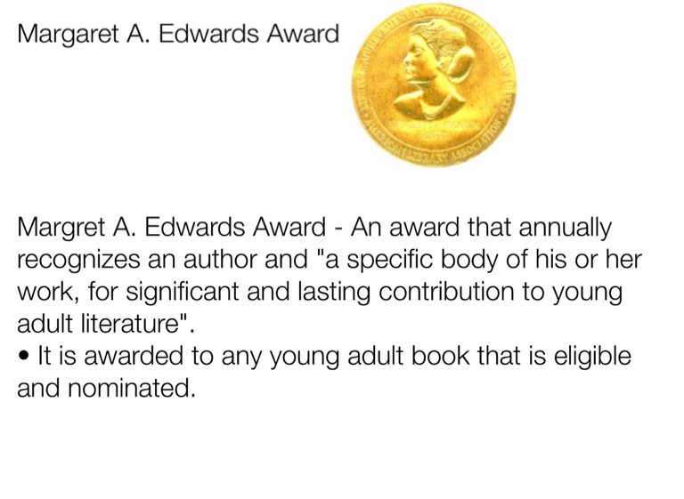 Margret A. Edwards Award - An award that annually recognizes an author and "a specific body of his or her work, for significant and lasting contribution to young adult literature".