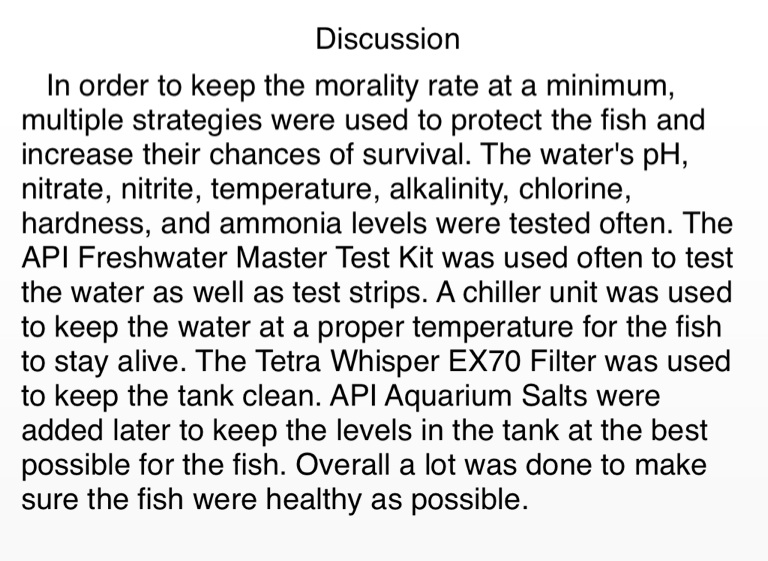 In order to keep the morality rate at a minimum, multiple strategies were used to protect the fish and increase their chances of survival. The water's pH, nitrate, nitrite, temperature, alkalinity, chlorine, hardness, and ammonia levels were tested often. The API Freshwater Master Test Kit was used often to test the water as well as test strips. A chiller unit was used to keep the water at a proper temperature for the fish to stay alive. The Tetra Whisper EX70 Filter was used to keep the tank clean. API Aquarium Salts were added later to keep the levels in the tank at the best possible for the fish. Overall a lot was done to make sure the fish were healthy as possible.